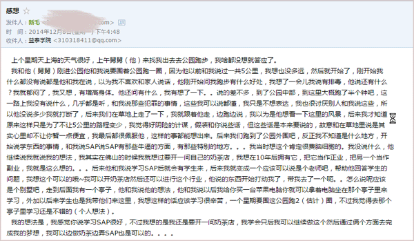 我们村一个外嫁的小姑(年龄比我大不了几岁,辈分大我一辈)的小孩今年快18岁了。初中毕业后去读了一个职业技术学校两年,毕业后到东莞工作一小段时间,但是又不想继续工作了。在端午节他妈找到我的弟弟,说希望把她的小孩来学习我们这一行的SAP技术...
