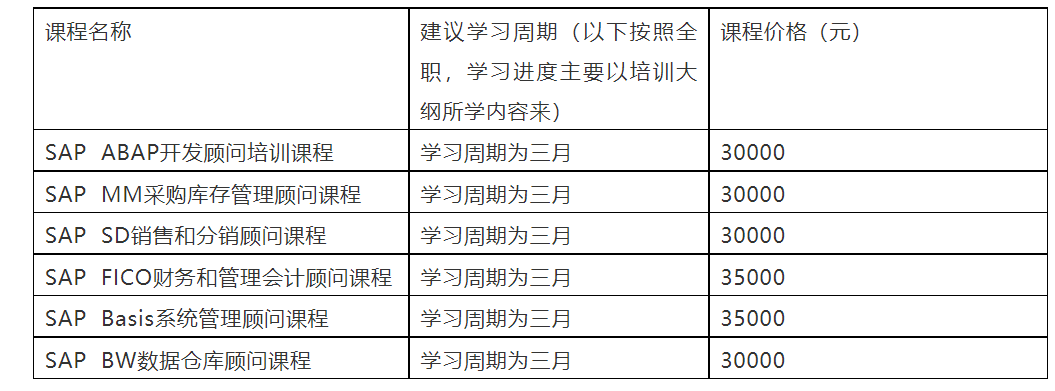 SAP官方的顾问学院培训课程培训周期短,价格较高,目前最优惠价在2000元一天,参加典型的ABAP编程,SD销售分销,MM物资管理(采购和库存)优惠后的推广价格是3.8万元,周期19天,FICO(财务和管理会计,目前这在SAP官方培训当做两门课程,一共36天,价格7.6万),Basis价格8.7万。一般的大学生很难去参加这样的培训。