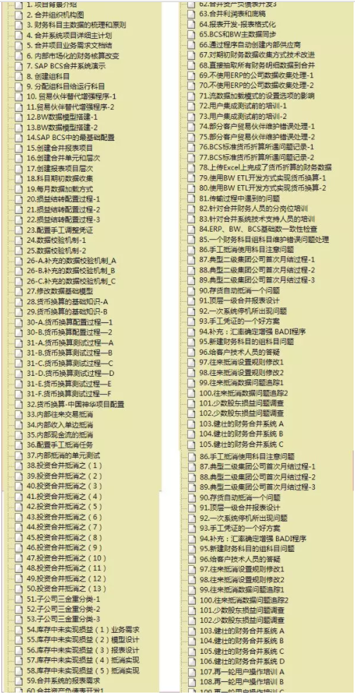 我以前在制作SAP BCS的学习材料时,当时想着,很多人想基于实际项目学习这一类技术。所以2014年制作了长达114节的SAP BCS实际项目视频,而且很多小节时长超过60分钟。当时没有制作基于假设几家模拟公司的SAP BCS培训用视频。后来用这个视频培训内部同事,同事给我反馈,这些实际项目方面的视频,完全无法自己同样操作,学习内容过于冗长和枯燥,而且涉及到很多其他模块的知识,比如Basis,BW,ABAP开发的知识,这些知识融合在一个体系中,对一个初学者难度太大。建议我另外制作只有几家虚拟公司,包含母公司,子公司,孙公司;也2-3个合并组,有使用其他货币的公司,也有通过文件上传数据的不使用ERP系统的公司的数据,用更精练方式来讲述。但是当时没有精力再去这样做。这些制作的内容可以通过:http://www.yitaiedu.com/sap/fi/index.htm 了解到。每个视频的标题如下: