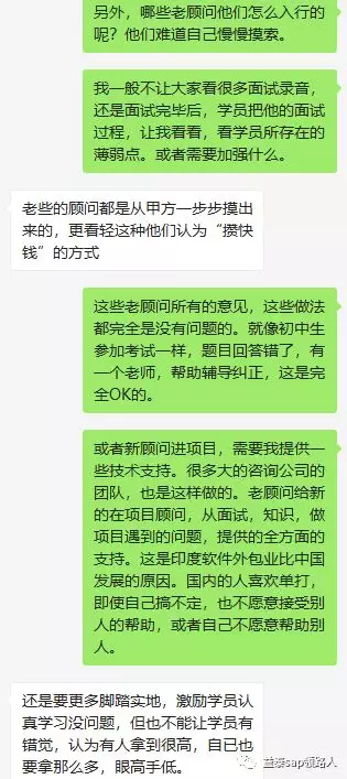 2. 一些SAP老顾问非常了解SAP顾问行业的薪水情况和工作性质,他们有时候会遇到一些自己的亲戚朋友,但是他们自己去教的话,会存在一些困难,就好像,我的一个朋友说,他自己教SAP, 但是他儿子要学习SAP,还是找我比较好,说老爸和儿子在教和学的过程中,容易发生冲突。另外,如果不是特别亲的,有如兄弟姐妹一样,教是一个大问题,教是需要付出时间和精力的,但是亲戚你又不能收费,如果没教好,反而多出来一个事情来,你要求严,亲戚不会记住你对他的好,但是会记住你曾对他凶过。所以我希望我的培训给一些SAP领域的老顾问解决一个实际的问题。我把我的培训尽可能的公开透明化,这些老顾问朋友就知道我的培训和其他的培训可能不一样,也许质量不错,在他们遇到有这样的需求,能想到我这里是一个好的解决方案。