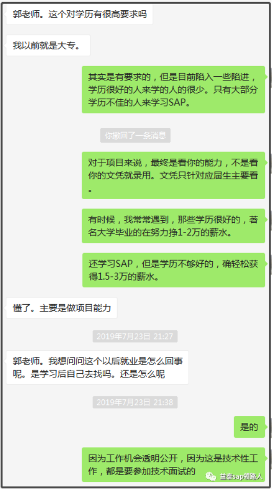 Johnson41的姐姐原来是我的SAP BPC的学员,她是FICO顾问,现在他姐姐建议他转行并学习SAP。Johnson41是正规统招大专毕业,当前年龄26岁,非常合适,我感觉Johnson41是非常优质有潜力的学员。这个年龄的学员比较容易控制住自己不贪玩,能努力学习。加上他姐姐本来是SAP顾问。当然还需要通过实际的学习1-2个星期,来完全肯定这一点。