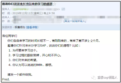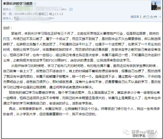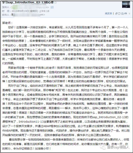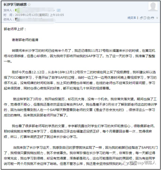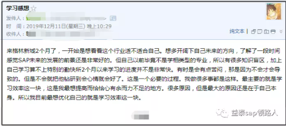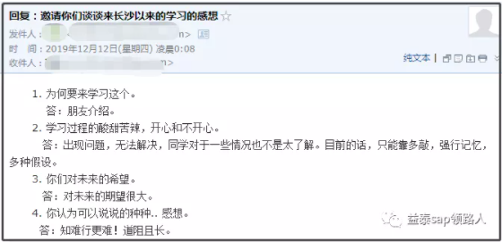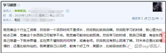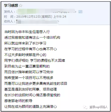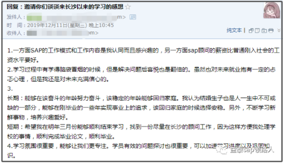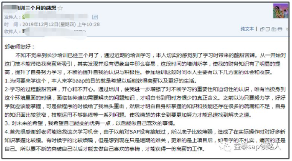 去年的时候,曾邀请一批的同学在试学一个月后谈谈学习感想。其中所有人都获得在他们的年龄段算是非常好的薪水,目前很多人对SAP领域的工作感到非常满意,全国各地跑,能见到很多人和事,能在很多不同的好公司里工作。