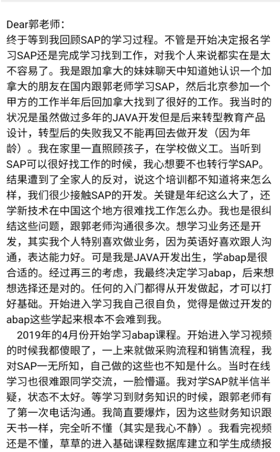 我告诉她,不要太着急,照顾家里老人和小朋友是第一位的。她的学习时间和速度不能和长沙集中学习的那些同学做比较,他们每天几乎只做一件正式的事情:SAP的学习。这段时间抽不开身,就暂停学习即可。等你自己感觉有时间后再重启学习。我告诉她,我们有同学学习了两年,因为那位学员还一直在银行工作,目前没有准备更换工作的打算,也有一位同学因为身体原因,几乎中断了差不多一年的时间的学习,等身体完全没有问题之后再重启学习。