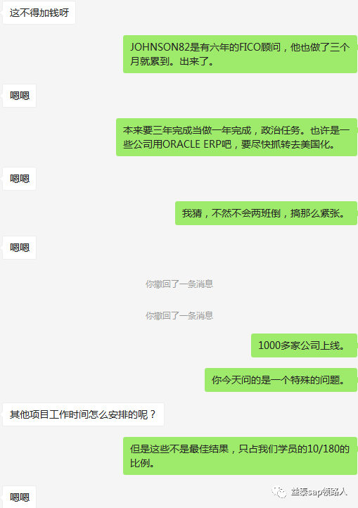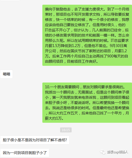 5. 以下提到的目前还不是很好的例子,其实有部分是暂时的,非学习原因暂时没有学习的,可以等待一段时间继续复习学习,也有可能重新获得很好的SAP领域工作。另外是暂时遇到的项目困难,甚至有一位一天都没有耽误,9月30日他从第一家甲方离职,10月8日到另外一家甲方入职,他在国庆假期找到第二家的工作机会,2个月后自己感觉能力上来之后,又找了900元每人天的自由顾问工作,达到了接近1.9万税后月薪的工作,这也是很好的最终结果了。