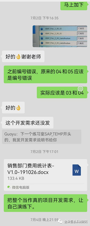 其实刚开始看郭老师的ABAP的课程时,也确实感觉到不轻松,还记得当时第一次接触报表开发时,为了理解表与表之间得逻辑,有些课看了3遍以上,同时这也让我发现记笔记的重要性,没有笔记的辅助,看完的课很容易忘记。第一次独立开发应收应付账龄表时,当时的脑袋是懵的,一片空白,幸好期间得到郭老师的提示,加上我大量的查阅网上的资料,终于搞懂了过账日期,基准日期,清账日期以及账龄截止日期的概念和它们之间的关系,当我最终成功开发出这个报表时,不仅仅是在知识能力上获得了提升,更重要的是这是零到一的突破,大大增强了自己的独立开发的信心。在之后的接口,增强,界面的学习中,每当遇到需要独立开发的作业时,想想之前自己成功过,也就大大的减少了自己的恐慌心理。当然,每当我遇到我尽力了但依然无法解决的问题时,郭老师总能耐心的和我分析,解决我的问题。