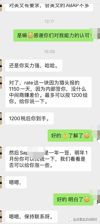 面试结果:第一次面试就通过,获得1200元每天的自由顾问工作机会,项目周期长期,世界500强企业,工作环境一流,大部分时间是可以在家上班的,因为我们之前有顾问在SAP LABS工作了一年。自己报价1000元每天,猎头帮他报价1150元,最后签单公司再给他增加50元。最终获得的OFFER比自己所报价期望的多200元每天,最终价格是1200元税后每天,折合月薪每月大约2.5万元以上的薪水水平。