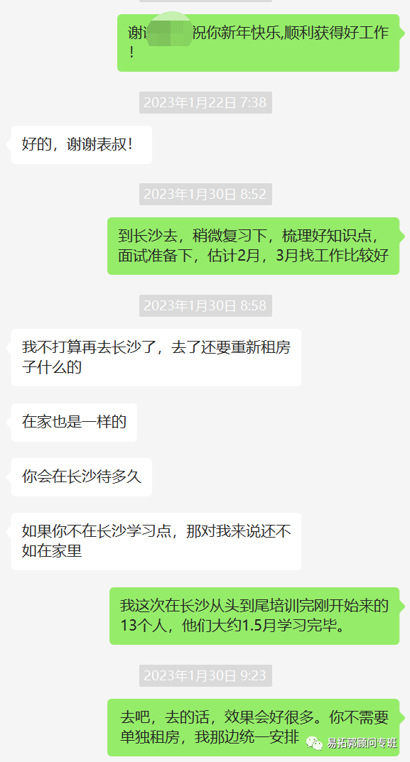 在老师的建议下,在没有找到工作前,应该到长沙集中学习点会更好一些,避免在家里各种事情、或者松散的情绪导致对找工作不利,她于2023.02.26再次去长沙,到2023.03.10日参加了第一次面试,第一次面试就通过了。今年,无论从头条新闻等各种信息来看,反而2023年这段时间各种企业裁员,企业关闭营业,就业市场非常艰难,对学员们刚毕业出去找工作充满了挑战。