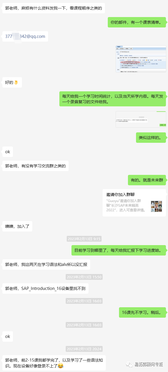 在兄弟的引荐下,我认识了郭老师。起初交流时郭老师鉴于我的工作经历推荐学习FICO模块,因为FICO模块也是郭老师的拿手好戏,优秀的毕业学员无数。但我考虑到年龄以及语言劣势,还是想先从ABAP开发入手。