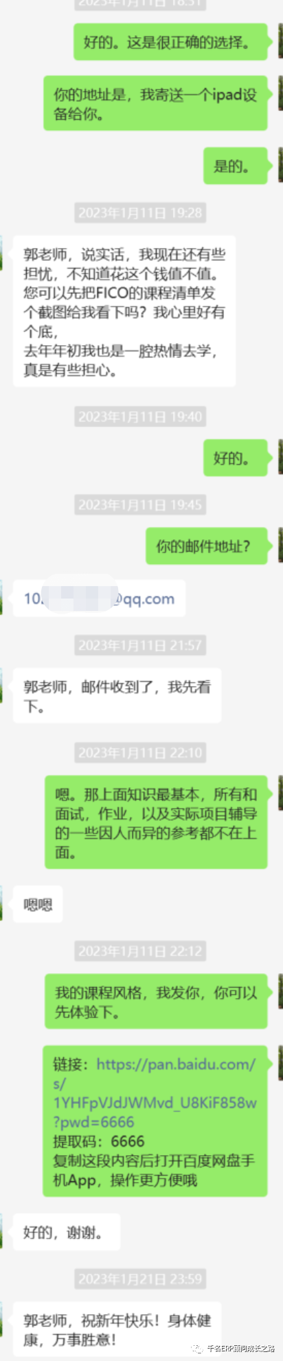 Johnson74的SAP学习之路历时6年。2012年左右参加过一个FICO培训,但是没有成功入行,但是2017年,我们联系,我希望他来学习SAP BCS,但是因为要支付学费1万元,他感觉对他有难度,工资卡都在老婆手里,实在没有自己能支配的钱,放弃,学半个月,安排他进入SAP BCS项目,人天单价大约1500元每天,他还是最终放弃了。2019年Johnson74最终决定来学习,因为他所在的公司人员优化导致他没有工作,不得不再来学习,学习SAP SD模块,第一份工作为浙江物产集团做SAP SD的运维,人天单价1300元每天,薪水比他裁员前大约6000元的月薪提高至少4倍,第二个项目到中国神华工作,真的是感谢裁员。