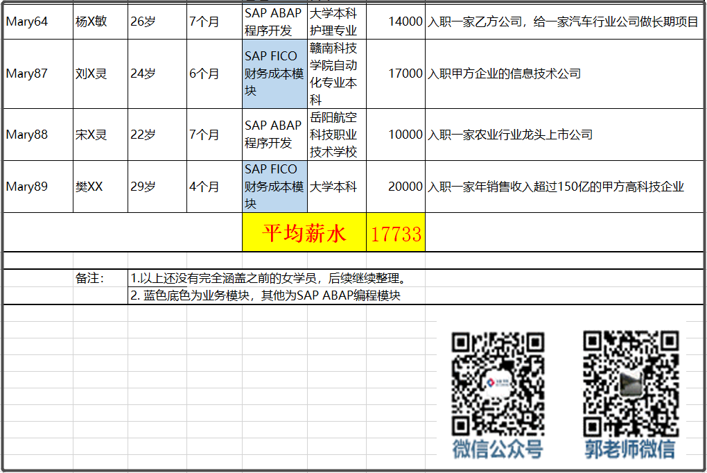 最初 Mary14选择学习 SAP FICO成本模块,在学习完毕,到 2019年春节过后准备开始找工作时候,因为每年春节后,很多工作经验的丰富的顾问也在这个时候面试项目,相比起来,Mary23年龄过小,加上没有很好的学历,经验显然不够丰富。几乎没有获得 SAP FICO的面试机会。此时,她提出来,对学历和年龄要求没有 SAP FICO那么高 SAP ABAP编程模块继续学习。经过一段时间的 SAP ABAP的学习,获得了 2.1万元的第一份工作的薪水水平。